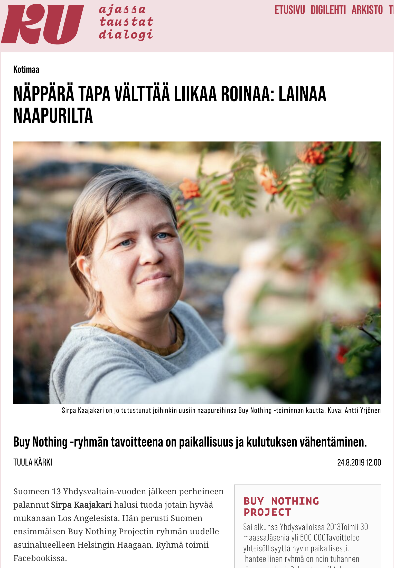 When Sirpa is not working, she is a passionate advocate of the The Buy Nothing Project, an international movement for recycling and building community. After moving back home from the US, she started Finland’s first Buy Nothing group. In June 2025, she was interviewed by Vantaan Sanomat.